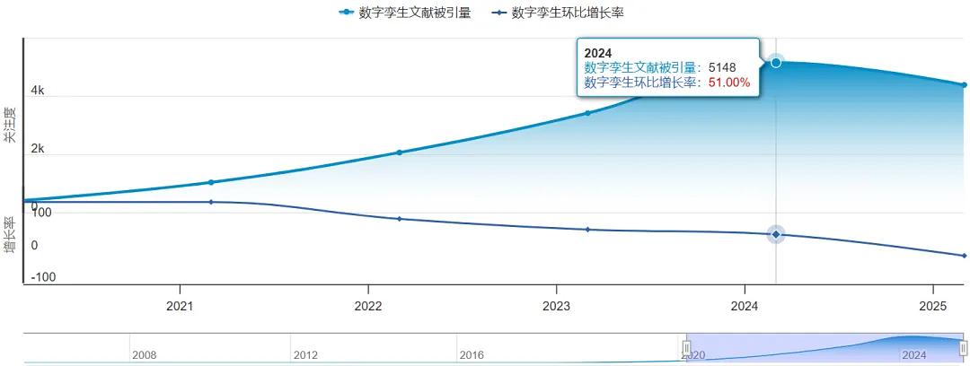 在过去五年中,数字孪生与城市建模领域的学术传播度呈现出稳步增长的趋势。根据图表数据,2024年成为了一个显著的高点,该年度相关文献的被引量达到了5148次,环比增长率也达到了51.00%。这一数据不仅反映了数字孪生与城市建模研究在学术界的关注度和影响力持续提升,也表明其研究成果在实际应用中的重要性和价值得到了广泛认可。尽管在2025年有所回落,但整体来看,近五年的数据揭示了该领域在学术研究和实践应用中的不断进步和日益增强的影响力,为未来的研究和政策制定提供了重要的参考依据。