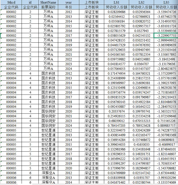 企业代码 企业代码 股票简称 年份 上市板块 劳动收入份额 劳动收入份额 劳动收入份额 行业代码 行业名称 沪深A股为1,否则为0 北京A股为1,否则为0 制造业为1,否则为0