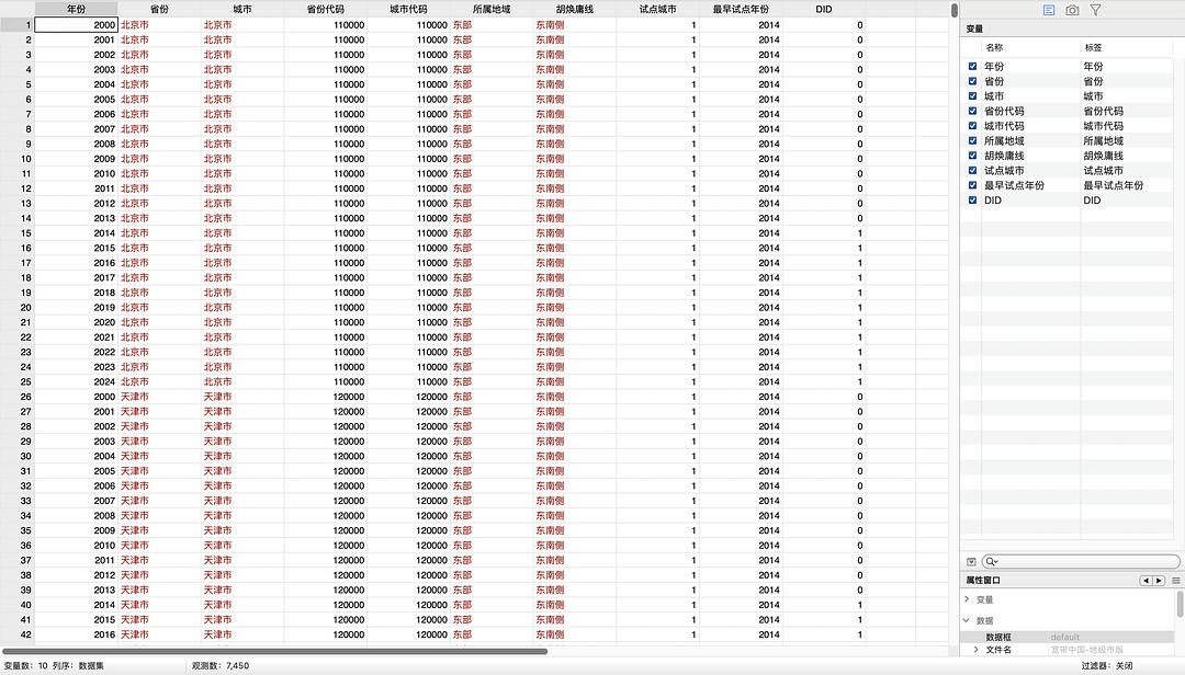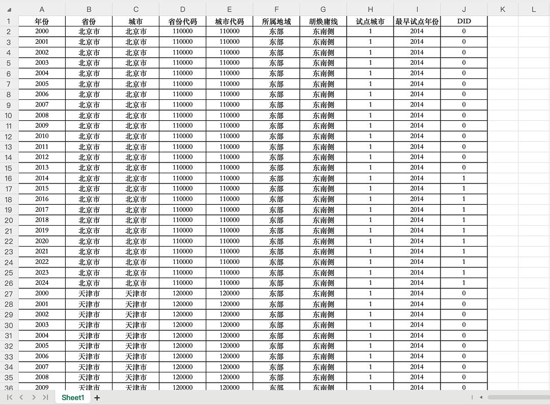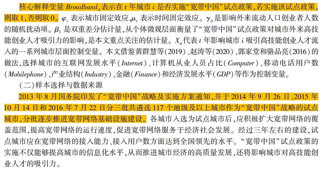 参考《经济研究》焦豪等(2023)、《经济问题探索》秦文晋(2022)对于“宽带中国”试点政策DID的做法,将选为“宽带中国”试点城市的虚拟变量作为核心解释变量,当一个城市被批复成为“宽带中国”试点城市当年及以后,该变量取值为1,未入选则为0