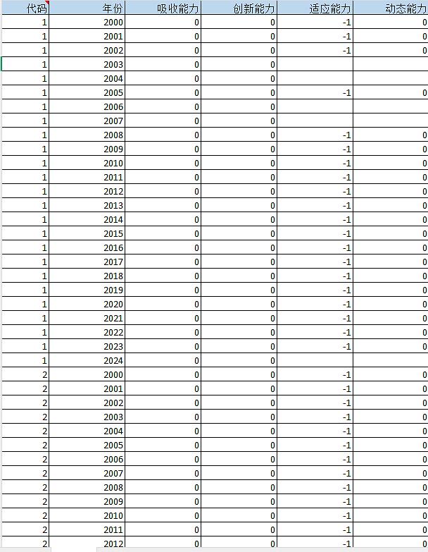 代码 年份 吸收能力 创新能力 适应能力 动态能力
