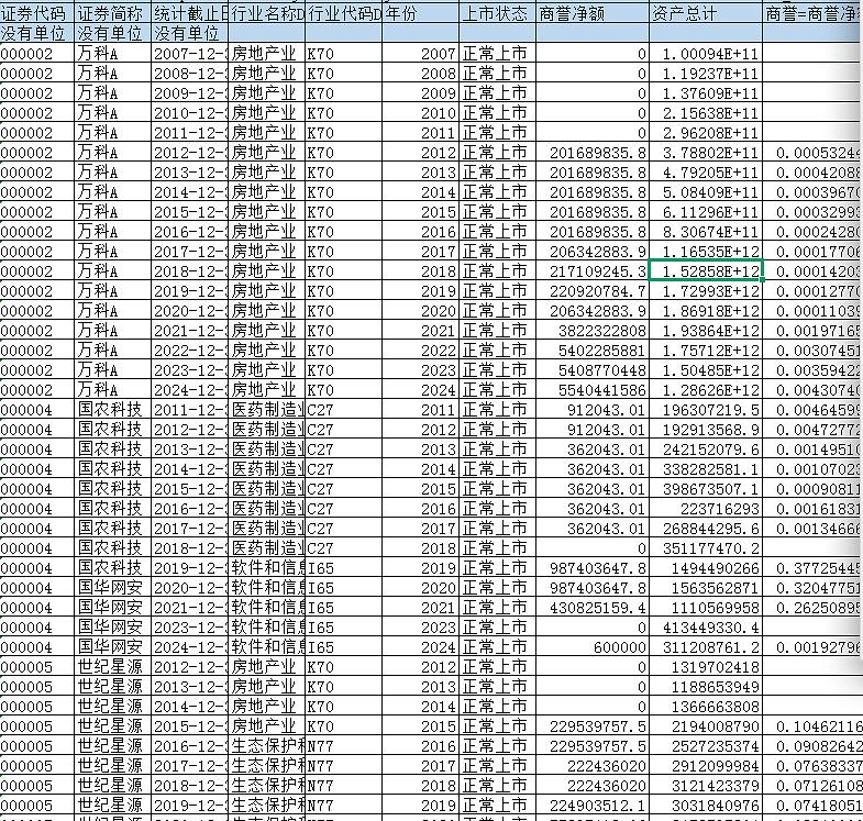 证券代码 证券简称 统计截止日期 行业名称D 行业代码D 年份 上市状态 商誉净额 资产总计 商誉=商誉净额/总资产 行业商誉水平 经行业中位数调整 经行业均值调整