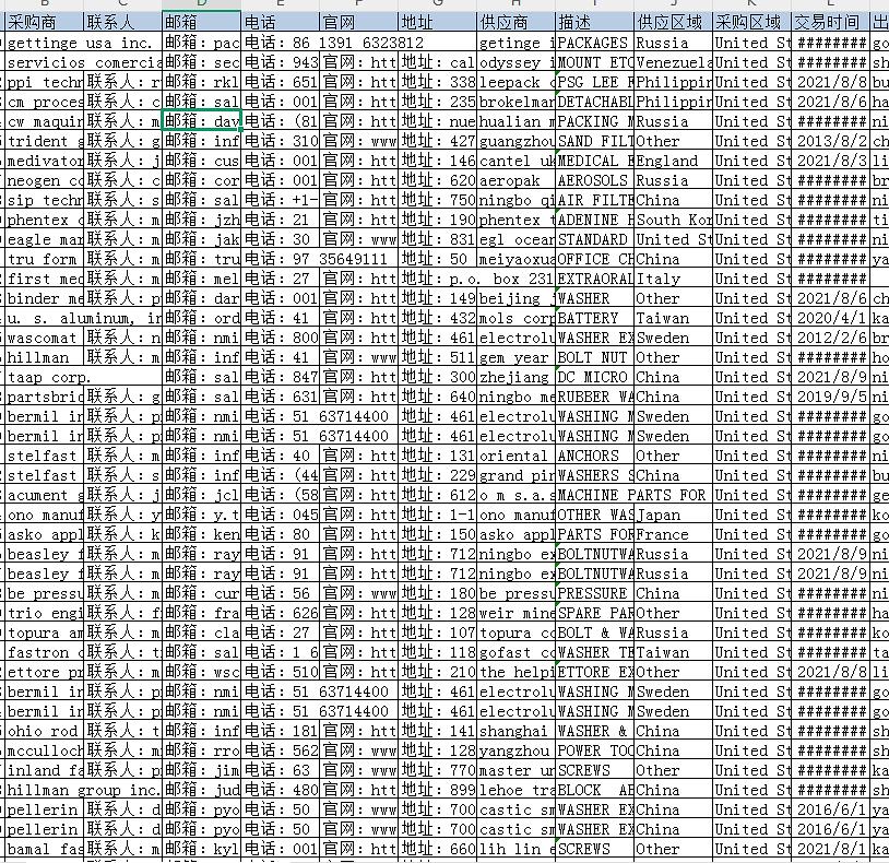 采购商 联系人 邮箱 电话 官网 地址 供应商 描述 供应区域 采购区域 交易时间 出货港口 卸货港口 总金额 提单编号