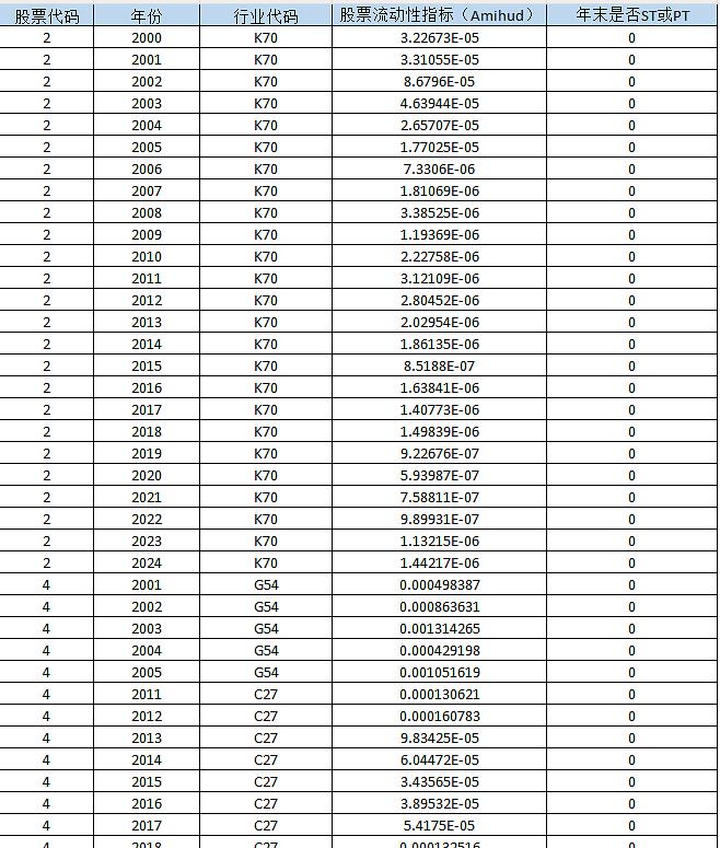 股票代码 年份 行业代码 股票流动性指标(Amihud) 年末是否ST或PT。