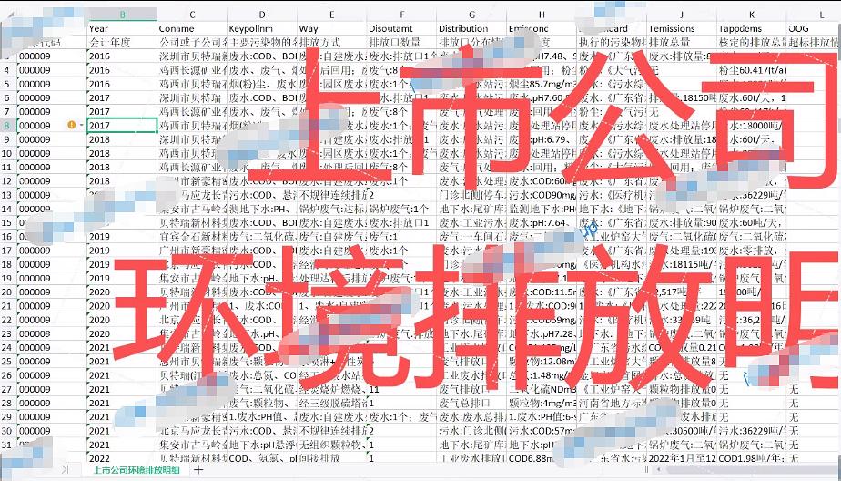 3️⃣上市公司环境排放明细2016-2024 股票代码、会计年度、公司或子公司名称、主要污染物的名称、排放方式、排放口数量、排放口分布情况、排放浓度、执行的污染物排放标准、排放总量、核定的排放总量、超标排放情况