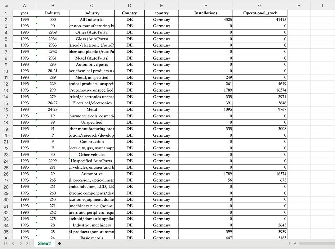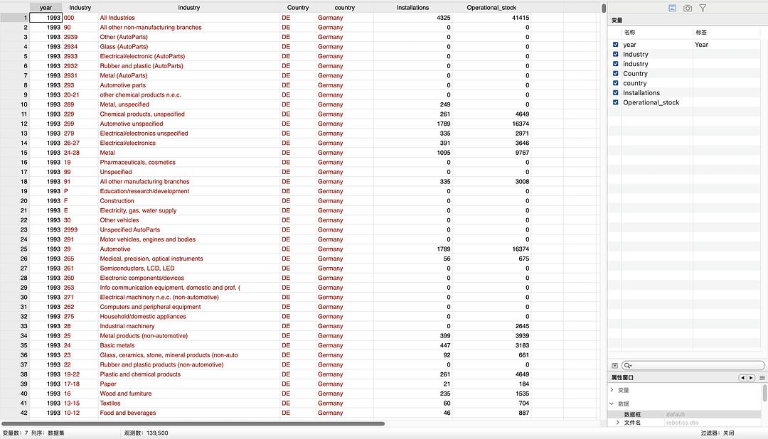 常用该数据衡量各国或行业的自动化水平、技术进步与产业结构升级,并结合企业或区域层面数据分析机器人普及对生产率、就业、绿色转型与资本结构等经济变量的影响,广泛应用于国际比较、政策评估和数字经济实证研究中