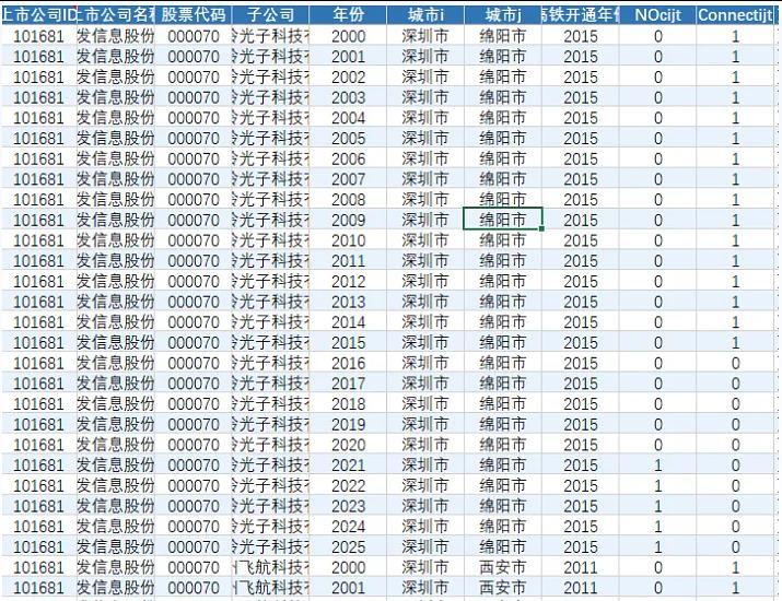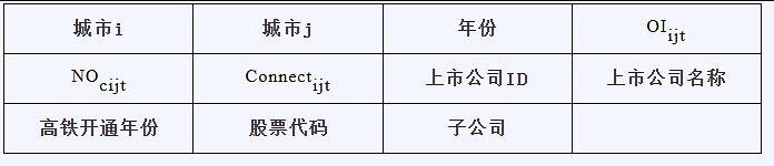 本数据以CNPD版上市公司及子公司经营数据、高铁开通班次数据为基础,选取2000年至2023年间上市公司在异地投资子公司信息,依据两地之间高铁开通年份构造变量。参考马光荣等(2020)的构造方法,计算出第t年城市i的所有母公司在城市j已设立的所有子公司数量OIijt,形成城市i—城市j—年份t的面板数据,简称为城市—城市对—年份层面数据;计算母公司位于i城市的c上市公司在第t年在城市j设立子公司的数量NOcijt,形成母公司c—城市j—年份t层面的面板数据,简称公司—城市对—年份层面数据;两者的关键解释变量Connectijt均为虚拟变量,取值规则为城市i和城市j之间在第t年已经开通高铁车次,取值为1,否则为0。