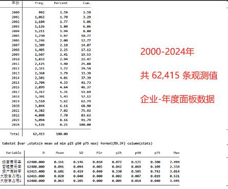 范围:2000 - 2024 年,共 62,415 条观测值,全部A股上市公司