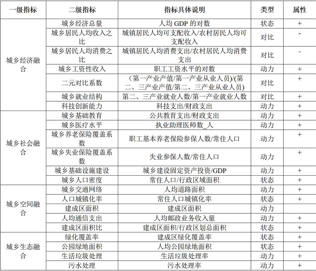城乡融合发展是指打破城乡二元结构,促进城乡要素双向自由流动与公共资源均衡配置,最终实现城乡功能互补、产业互促、居民生活质量差距缩小的协调发展状态。目前,城乡融合发展水平的测算并没有统一标准,核心是构建多维度指标体系,通过定量方法将 “融合程度” 转化为可比较的数值,以评估城乡协调发展的实际状态