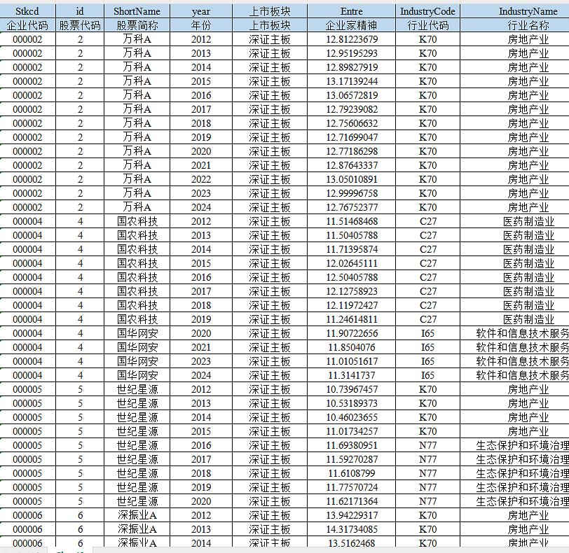 企业代码 股票代码 股票简称 年份 上市板块 企业家精神 行业代码 行业名称 沪深A股(沪深A股为1,否则为0) 北京A股(北京A股为1,否则为0) 制造业(制造业为1,否则为0)