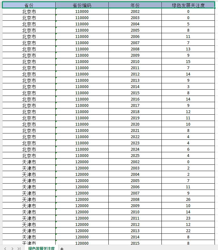 省份 省份编码 年份 绿色发展关注度