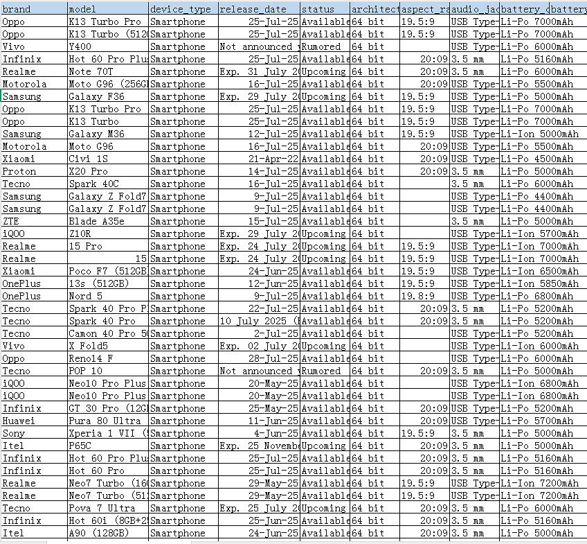 本数据集汇聚了超 4144 部智能手机及移动设备的详尽规格信息,这些设备源自 116 个以上不同品牌,数据采集时间为 2025 年 7 月 。它堪称当下最为全面的移动设备规格汇总之一,不仅涵盖了当前市场在售的各类设备,还囊括了可追溯至 2012 年的众多历史机型。