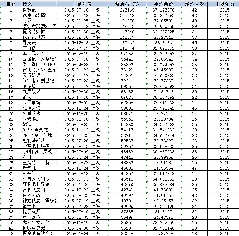 排名 片名 上映年份 票房(万元) 平均票价 场均人次 上榜年份