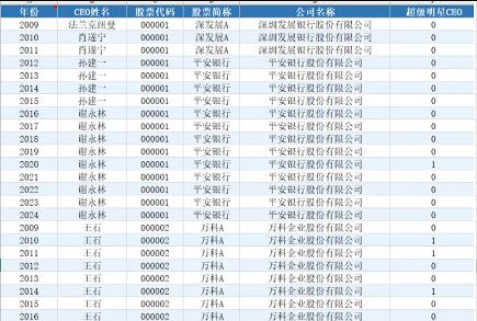 - 数据字段: 年份、CEO姓名、股票代码、股票简称、公司名称、超级明星CEO