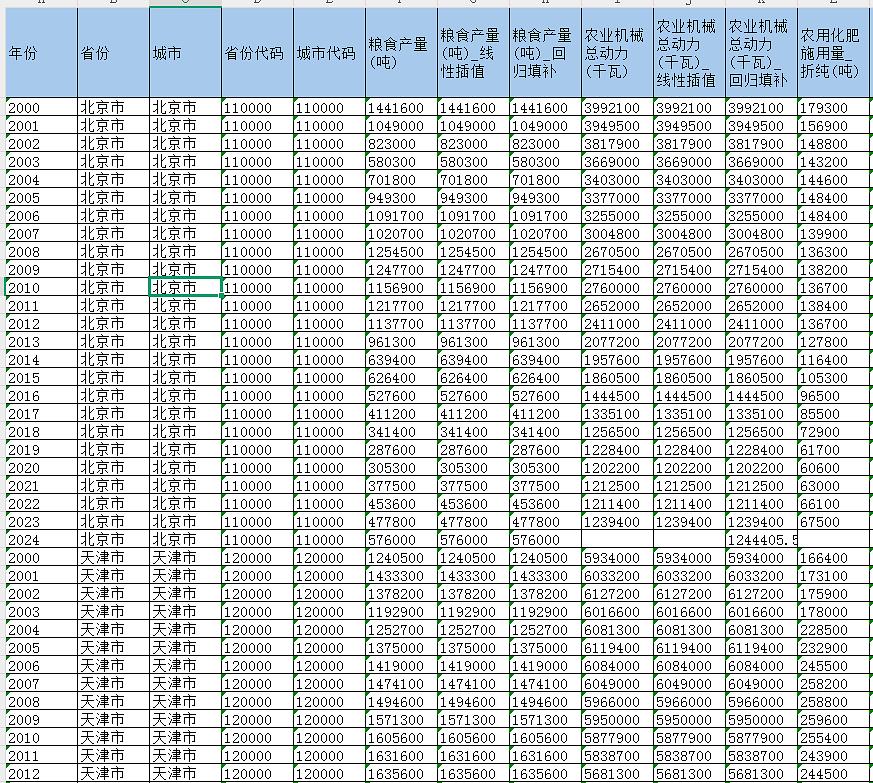 年份 省份 城市 省份代码 城市代码 粮食产量(吨) 粮食产量(吨)_线性插值 粮食产量(吨)_回归填补 农业机械总动力(千瓦) 农业机械总动力(千瓦)_线性插值 农业机械总动力(千瓦)_回归填补 农用化肥施用量_折纯(吨) 农用化肥施用量_折纯(吨)_线性插值 农用化肥施用量_折纯(吨)_回归填补 农作物总播种面积(公顷) 农作物总播种面积(公顷)_线性插值 农作物总播种面积(公顷)_回归填补 粮食播种面积(公顷) 粮食播种面积(公顷)_线性插值 粮食播种面积(公顷)_回归填补 总产值_农、林、牧、渔业(万元) 总产值_农、林、牧、渔业(万元)_线性插值 总产值_农、林、牧、渔业(万元)_回归填补 总产值_农业(万元) 总产值_农业(万元)_线性插值 总产值_农业(万元)_回归填补 农村全社会用电量(万千瓦时) 农村全社会用电量(万千瓦时)_线性插值 农村全社会用电量(万千瓦时)_回归填补