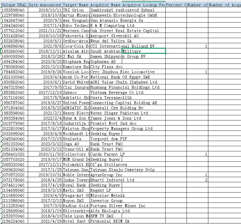 Unique DEAL ID Date Announced Target Name Acquiror Name Acquiror Lockup Pecentage Percent Owned by Acquiror Post Merger Number of Acquiror Financial Advisors Number of Acquiror and Target Financial Advisors Acquiror is a Financial Sponsor (Yes/No Flag) Acquiror is a Leverage Buyout Firm Acquiror is a Limited Partnership Flag Acquiror Market Value 4 Weeks Prior to Announcement ($mil) Acquiror is a Special Purpose Acquisition Vehicle Flag Deal Attitude Attitude Change Flag Acquiror is a White Knight Flag Buyside Hedge Fund Involvement Flag Challenged Deal Flag Competing Bidder Common Shares Sought in Tender Offer (mil) Date Announced is Estimated Flag Original Date Announced Date Effective Debt Offer Flag Target Company Date of Financial Deals is a Divestiture Flag Division Date of Tender Offer Date Effective/Unconditional Date Withdrawn Form of transaction Any Hedge Fund Involvement Flag Target Market Value 4 Weeks Prior to Announcment ($mil) Number of Acquiror Legal Advisors Number of Target Legal Advisors Percentage of consideration paid in cash Percentage of consideration paid in other then cash or stock Percentage of consideration paid in stock Percentage of consideration which is unknown Percentage of Shares Acquired Percentage of Shares Owned After Transaction Percentage of Shares Held at Announcement Date Percentage of Shares Held 6 Months Prior to Announcement Percentage of Shares Sought Percentage of Shares Acquiror is Seeking to Own After Transaction Percentage of Shares Sought Through Tender Offer Percentage of Shares Tendered in Tender Offer Related Deals Flag Recapitalization Flag Deal is a Repurchase Flag Deal is part of a Restructuring Flag Rumored Deal Flag Secondary Buyout Flag Source of Funds Borrowing Flag Financing via Bridge Loan Flag Source of Funds Common Stock Issue Flag Financing via Internal Corporate Funds Flag Financing via Debt Securities Flag Financing via Foreign Lender Flag Financing via Junk Bond Flag Financing via Line of Credit Flag Financing via Mezzanine Credit Flag Financing via Preferred Stock Offering Flag Financing via Rights Offering Flag Financing via Staple Offering Flag Transaction is a Spinoff Flag Transaction is a Splitoff Flag Deal Status Deal Statuscode Deal is a Self Tender Flag Percent Owned by Target Post Merger Number of Target Financial Advisors Deal is a Tender Offer Flag Deal is a Tender Merger Flag Ranking Value incl Net Debt of Target (USD Mil) Rank Date (Date of first public valuation) Value of Bridge Loan ($mil) Value is Estimated Flag Voting Control Acquired in this Transaction Acquiror CUSIP Acquiror SEDOL Acquiror Intermediate Parent Acquiror Intermediate Parent Name Acquiror Ultimate Parent CUSIP Acquiror Ultimate Parent Name Target CUSIP Target SEDOL Target Intermediate CUSIP Target Intermediate Parent Name Target Ultimate Parent CUSIP Target Ultimate Parent Name Acquiror Ultimate Parent SEDOL Target Ultimate Parent SEDOL TR Acquiror Industry Description TR Target Industry Description TR Acquiror Macro Description TR Target Macro Description Acquiror Nation Acquiror Nation Code Target Nation Target Nation Code Target Public Status Acquiror Public Status Target Primary SIC Code Target Ticker Symbol Deal Value Enterprise Value ($mil) Equity Value ($mil) Price Per Share Target Sales LTM ($mil) Target EBIT LTM ($mil) Target Pre-Tax Income LTM ($mil) Target Net Income LTM ($mil) Target Net Assets ($mil) Target Total Assets ($mil) Target Cash Flow LTM ($mil) Target Book Value ($mil) Target Common Equity ($mil) Target Earnings Per Share ($mil) Ratio of Offer Price to Earnings Per Share Target Financial Advisor Fees ($mil) Acquiror Financial Advisor Feesx ($mil) Total Financial Advisor Fees ($mil) Target Closing Stock Price 1 day Prior to Deal Announcement Day Target Closing Stock Price 1 weel Prior to Deal Announcement Day Target Closing Stock Price 4 weeks Prior to Deal Announcement Day Ratio of Rankvalue to Sales Ratio of Rankvalue to EBIT Ratio of Rankvalue to Cash Flow Ratio of Rankvalue to Net Income Ratio of Enterprise Value to Sales Ratio of Enterprise Value to EBIT Ratio of Enterprise Value to Cash Flow Ratio of Enterprise Value to Net Income Ratio of Equity Value to Sales Ratio of Equity Value to EBIT Ratio of Equity Value to Cash Flow Ratio of Equity Value to Net Income Offer Price to Target Stock Price Premium – 1 Day Prior to Announcement Offer Price to Target Stock Price Premium – 1 WeekPrior to Announcement Offer Price to Target Stock Price Premium – 4 Weeks Prior to Announcement Acquiror Business Description Target Business Description Source of Funds Type Deal Consideration Description Consideration Offered Consideration Sought