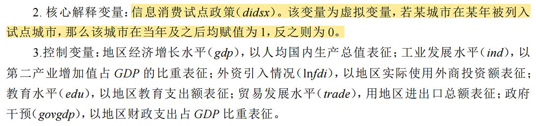 信息消费试点政策DID:该变量为虚拟变量,若某城市在某年被列入试点城市,那么该城市在当年及之后均赋值为1,反之则为0
