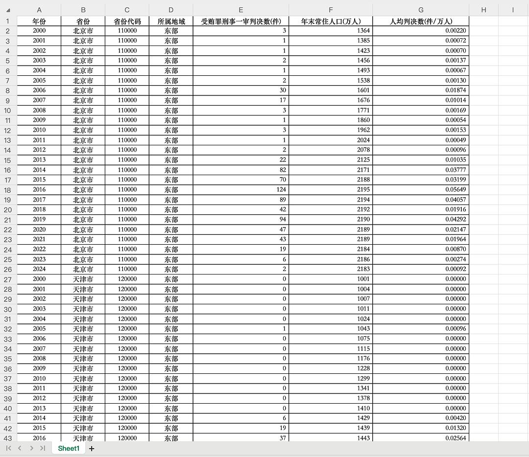 本文参考《经济学(季刊)》褚红丽等(2018)文中关于受贿罪数据整理的方法,从各级人民法院收集整理了历年国内各类司法案件,通过多维度筛选与标准化整理,构建全国31个省份受贿罪面板数据