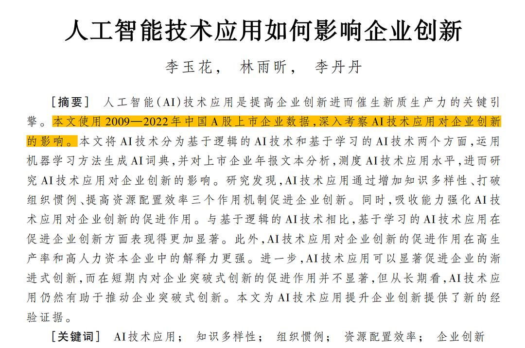 [1]李玉花,林雨昕,李丹丹.人工智能技术应用如何影响企业创新[J].中国工业经济,2024,(10):155-173.
