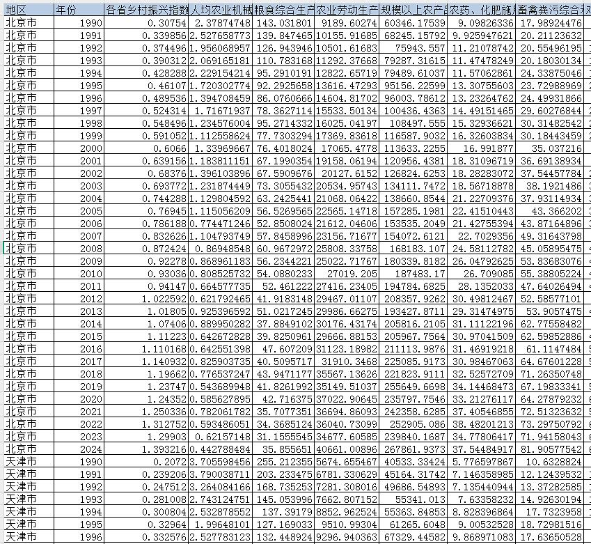 地区 年份 各省乡村振兴指数 人均农业机械总动力(千瓦) 粮食综合生产能力(万吨) 农业劳动生产率(元/人) 规模以上农产品加工企业主营业务收入(亿元) 农药、化肥施用量(万吨) 畜禽粪污综合利用率(%) 对生活污水进行处理的行政村占比(%) 对生活垃圾进行处理的行政村占比(%) 卫生厕所普及率(%) 农村绿化率(%) 农村居民教育文化娱乐支出占比(%) 农村义务教育学校专任教师本科以上学历比例(%) 农村居民平均受教育年限(年) 有线电视覆盖率(%) 开通互联网宽带业务的行政村比重(%) 乡村文化站数量(个) 村主任、书记”一肩挑“比例(%) 已编制村庄规划的行政村占比(%) 已开展村庄整治的行政村占比(%) 农民人均纯收入(元) 农民人均收入增长率(%) 城乡居民收入比(%) 农村贫困发生率(%) 农村居民恩格尔系数(%) 每百户汽车拥有量(辆) 农村居民人均住房面积(平方米) 安全饮用水普及率(%) 村庄道路硬化率(%) 人均道路面积(平方米) 农村每千人拥有卫生技术人员数(人)