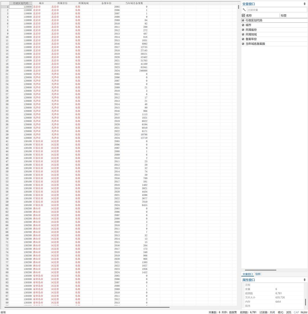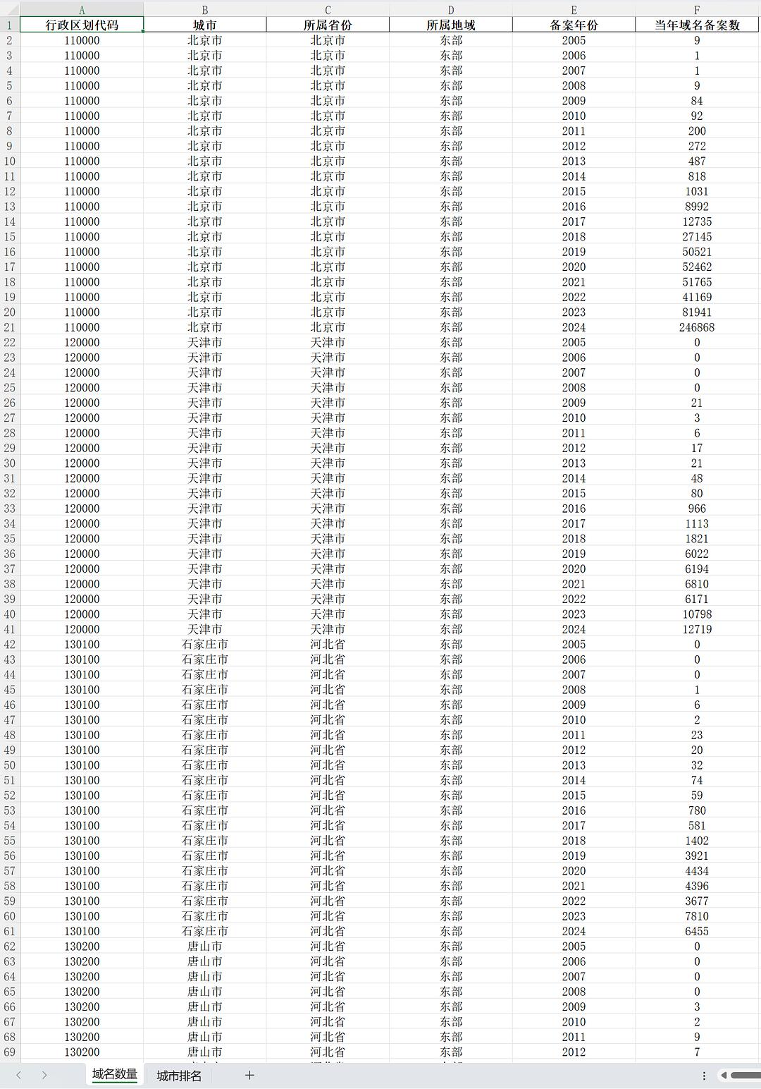 行政区划代码、城市、所属省份、所属地域、备案年份、当年域名备案数