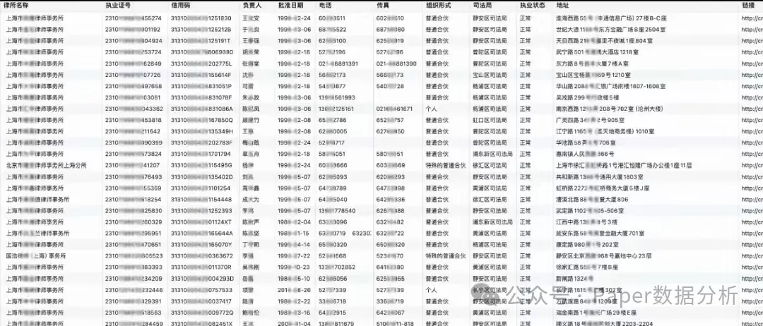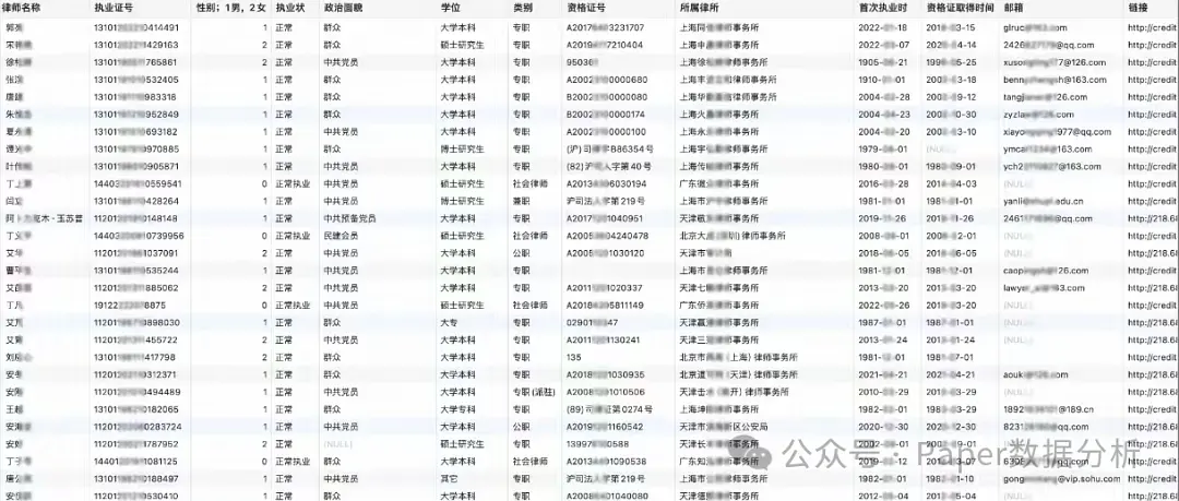 5、字段名称:律师名称、执业证号、性别、执业状态、政治面貌、学位、类别、资格证号、所属律所、首次执业时间、资格证取得时间、邮箱、链接律所名称、执业证号、信用码、负责人、批准日期、电话、传真、组织形式、司法局、职业状态、地址、链接