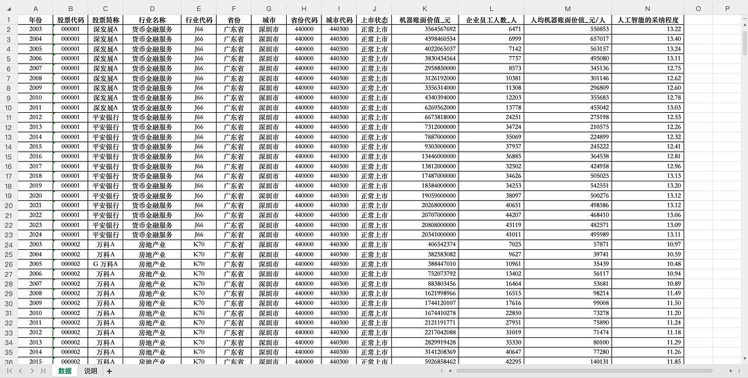 上市公司-人工智能采纳程度测算数据更新至2024年!上市公司人工智能采纳程度是指企业在其业务和运营中采用人工智能技术的广度和深度