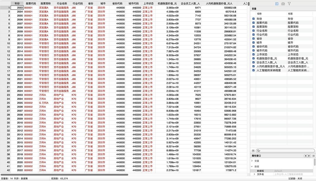 计算方法:人均机器账面价值=机器账面价值_元/员工人数_人人工智能的采纳程度=Ln(人均机器账面价值)