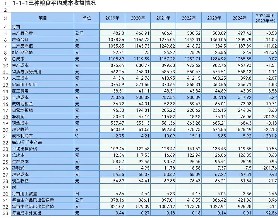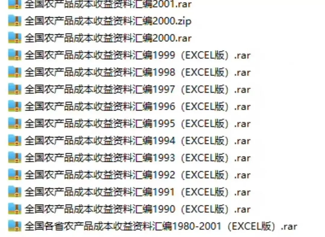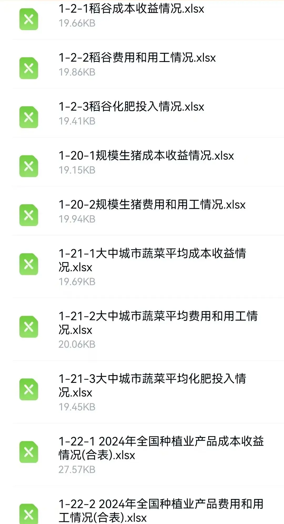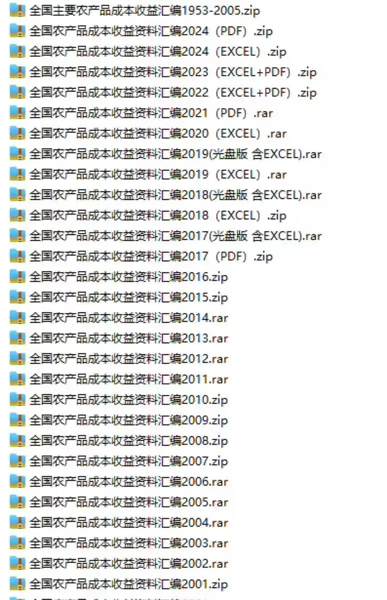 今日数据:《全国农产品成本收益资料汇编》1953-2025 一、数据介绍 全国农产品成本收益资料汇编由国家统计局主编,全国农产品成本收益资料汇编委员会编制。收录了我国年度主要农产品生产成本和收益资料。本汇编共分七个部分,即:第一部分,综合;第二部分,各地区粮食、油料;第三部分,各地区棉、烟、糖料;第四部分,各地区蚕茧、水果;第五部分,各地区肉、禽、蛋、奶;第六部分,各地区蔬菜;第七部分,各地区畜产品。 本次分享的汇编年度为1953-2025年!
