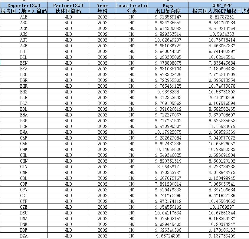 报告国(地区)简码 伙伴国简码 年份 分类 出口复杂度 报告国人均GDP加权平均数