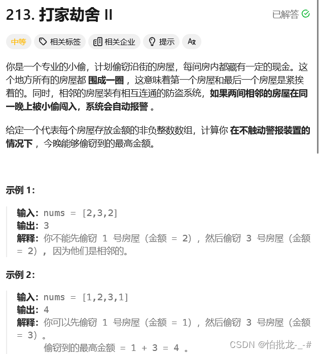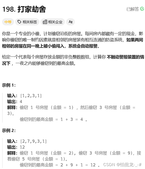 本文介绍了在LeetCode平台上涉及的三个打家劫舍问题的动态规划解法,包括基本打家劫舍、包含头尾限制和二叉树打家劫舍,通过递推公式和dp数组求解最大盗窃金额。