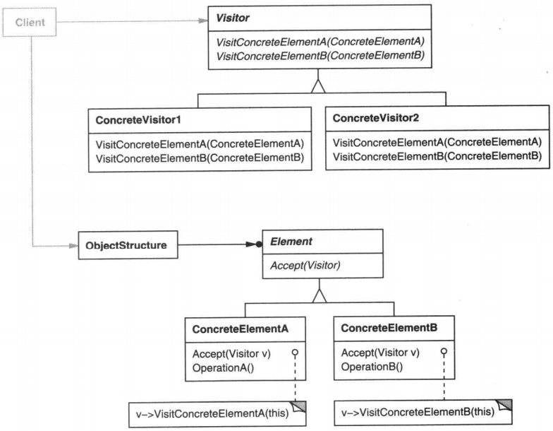 意图:GOF的书上有这样的描述:表示一个作用于某对象结构中的各个元素的操作。它使你可以在不改变各元素的类的前提下定义作用于这些元素的新操作。