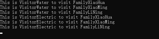 这里的访问者是水费收费员(VisitorWater)和电费收费员(VisitorElectric),对象结构是整个村庄(Village), 各元素为各个具体家庭((小华家)FamilyXiaoHua、(小明家)FamilyXiaoMing,(李宁家)FamilyLiNing ) 。其实看完这个实例的代码就可以大体理解上面意图中的描述了:"作用于对象结构中的对各个元素额操作",这里的对各个元素的操作其实就是定义在基类Visitor中的各个接口,“它使你可以在不改变各元素的类的前提下定义作用于这些元素的新操作",这句话其实是通过定义具体的访问者并实现自定义的具体接口来实现的。