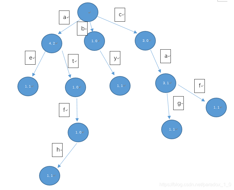 本文数据结构严格采用下面图示的结构进行编码,其中节点(圆圈内)内的数字左右分别表示{经过此节点的串数,此节点作为终结点的串数}。