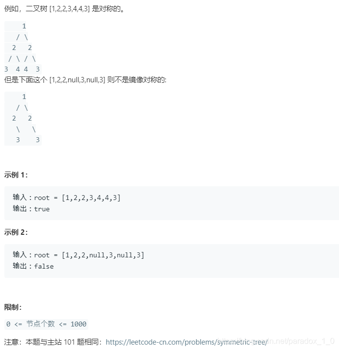例如,二叉树 [1,2,2,3,4,4,3] 是对称的。