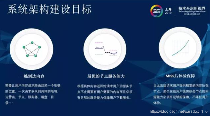 系统架构优化的第一个目标是一跳到达内容,这需要让用户内容请求路由到某一个明确的位置,国内网络存在流量重复下载和流量绕转问题,如何使用户一次请求获取到具体的地域、运营商、节点、服务器、磁盘和目录便是系统架构建设的第一任务。第二个目标是最优的节点服务能力,根据具体用户请求内容返回给请求用户的服务节点不止需要有用户需要的内容,而且必须有足够的服务能力保障用户下载服务。第三个目标是请求MISS后的用户体验保障,当无法给请求用户提供精准的可服务节点时,不能降低用户体验。