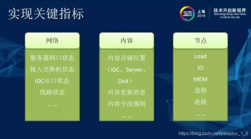 上图中列出的关键指标会影响到用户的使用体验,从网络方面来讲,服务器网口状态、接入交换机状态、IDC出口状态、线路状态等都是需要考虑的内容。从内容方面来讲,有内容存储位置(IDC、Server、Disk)、内容更新和内容存储规则等问题需要考虑。从单服务器节点角度出发,Load、IO、MEM、进程、线程、并发连接等问题需要考虑。这些指标都需要我们进行关注和分析。