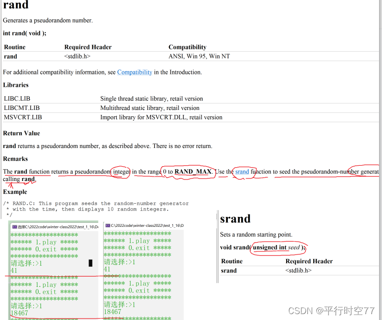 rand库函数必须使用srand函数调用,rand返回一个整形,不需要参数;srand需要一个无符号整型参数不需要返回值 ; 可以通过改变srand的参数改变rand 的数字