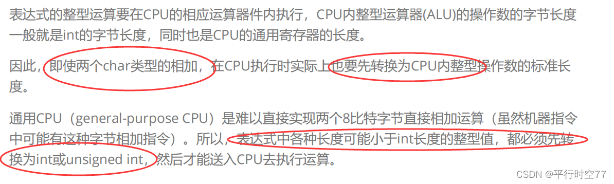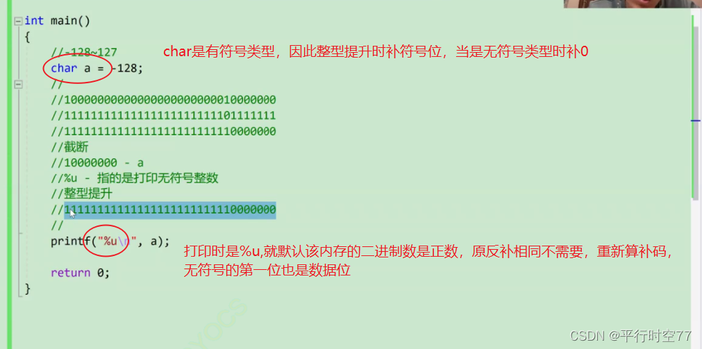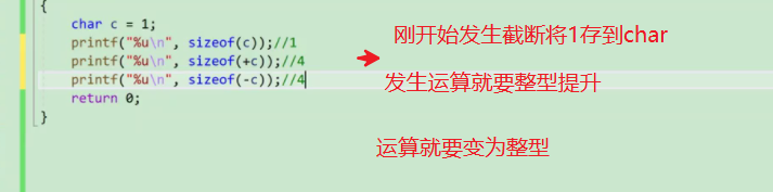 整型存在char中要截断,运算时要提升,打印时把补码换为原码,打印无符号数时默认该数就是正数不用换成原码。