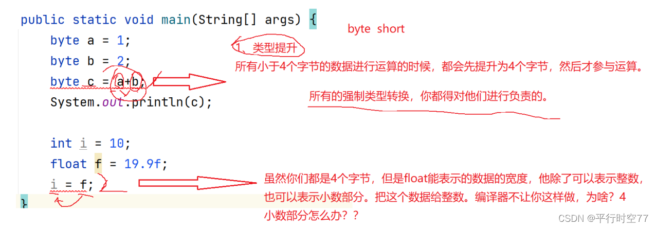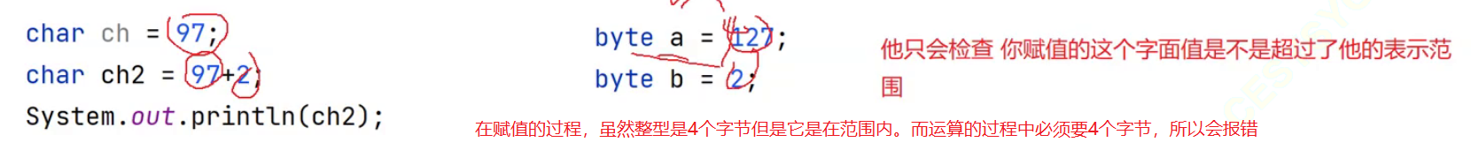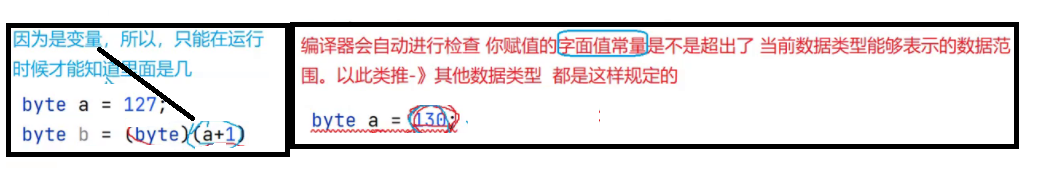 byte b2 = 257; // 编译失败,257超过了byte的数据范围,有数据丢失