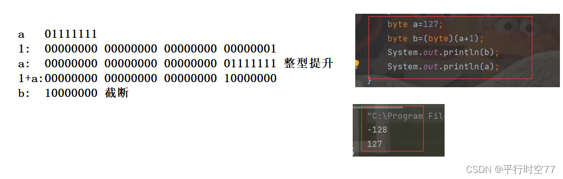 原因是, 虽然 a 和 b 都是 byte, 但是计算 a + b 会先将 a和 b 都提升成 int, 再进行计算,