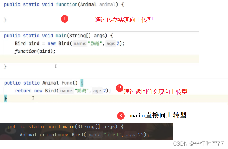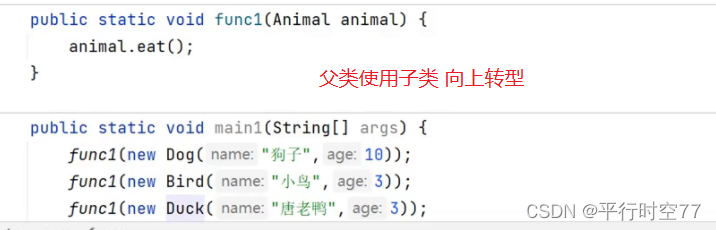 向上转型:实际就是创建一个子类对象,将其当成父类对象来使用。