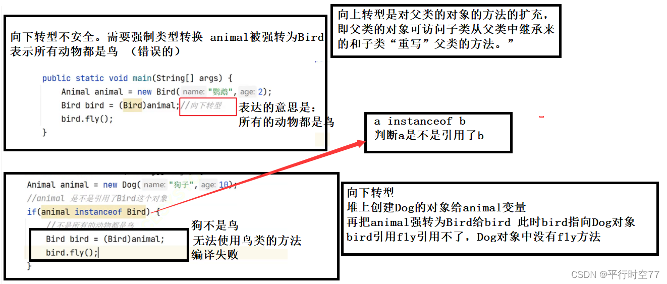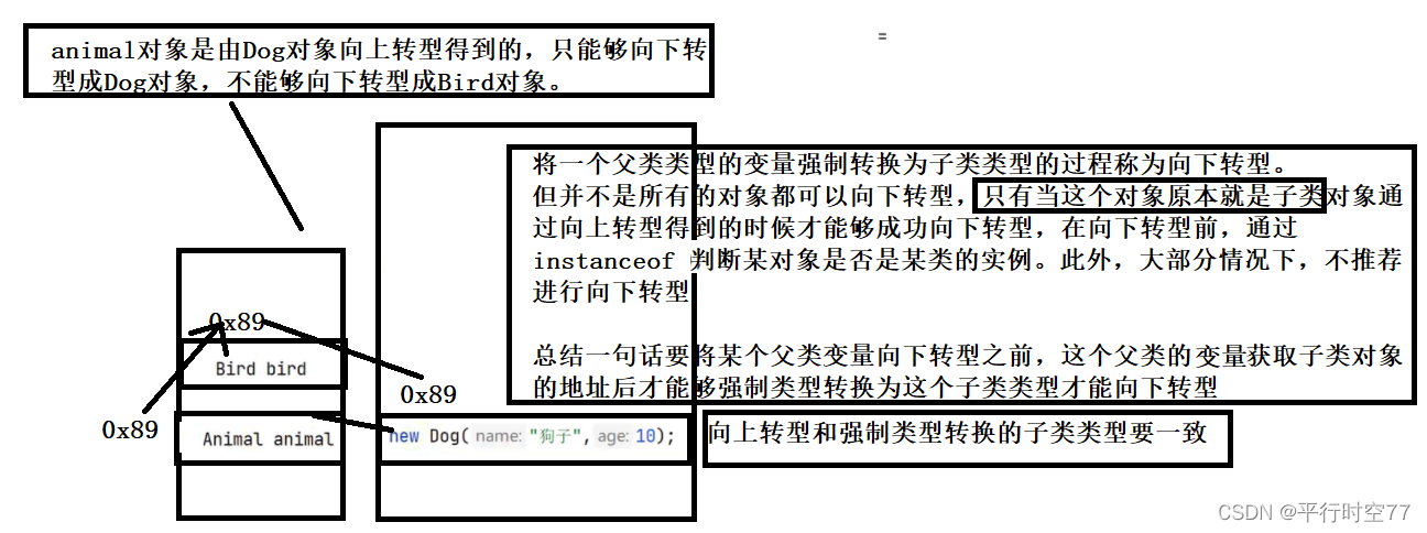 此时:将父类引用再还原为子类对象即可,即向下转换