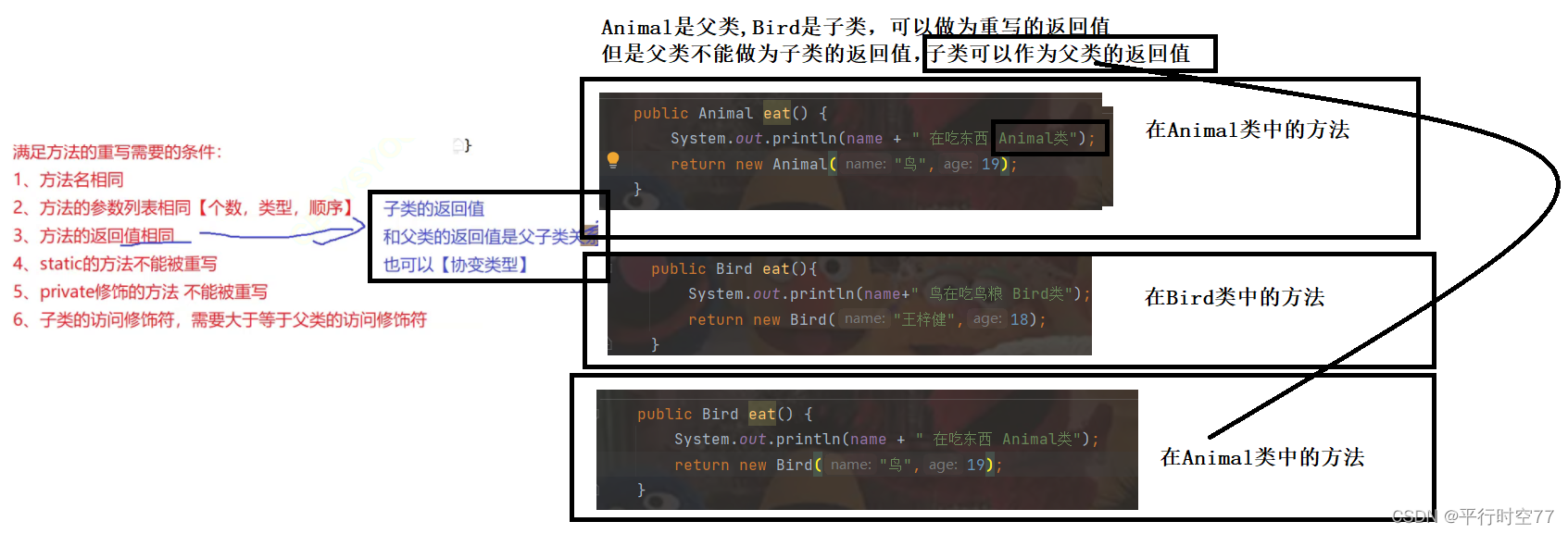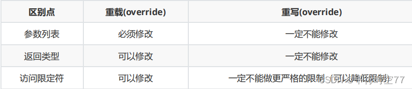 例如:如果父类方法被public修饰,则子类中重写该方法就不能声明为 protected
