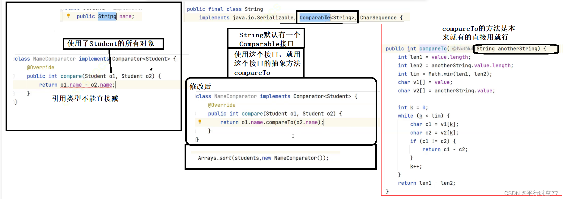 在 sort 方法中会自动调用 compareTo 方法. compareTo 的参数是 Object ,