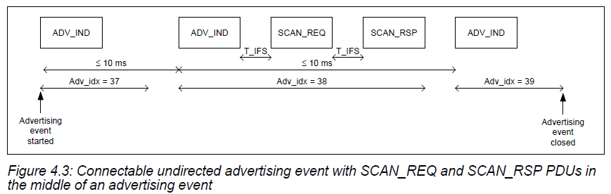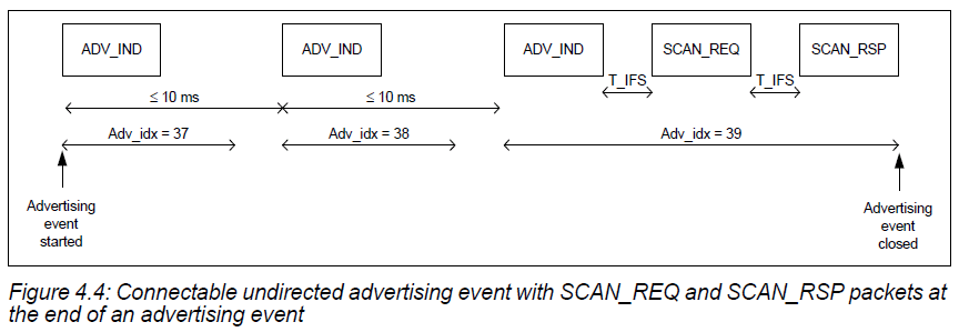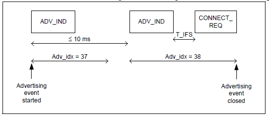 定向广播类型有特殊的时序要求。完整的广播事件必须每3.75ms重复一次。这一要求使得扫描设备只需扫描3.75ms便可以收到定向广播设备的消息。