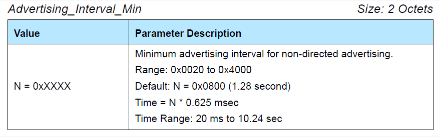 当然,实际设置过程中没有广播间隔参数,而是设置Advertising_Interval_Min(最小广播间隔)和Advertising_Interval_Max(最大广播间隔)这两个参数来调整广播间隔,它们都是以“0.625ms”为单位,如果要固定广播间隔为某一个值,只需要将这两个参数设置为同一个有效数值即可。