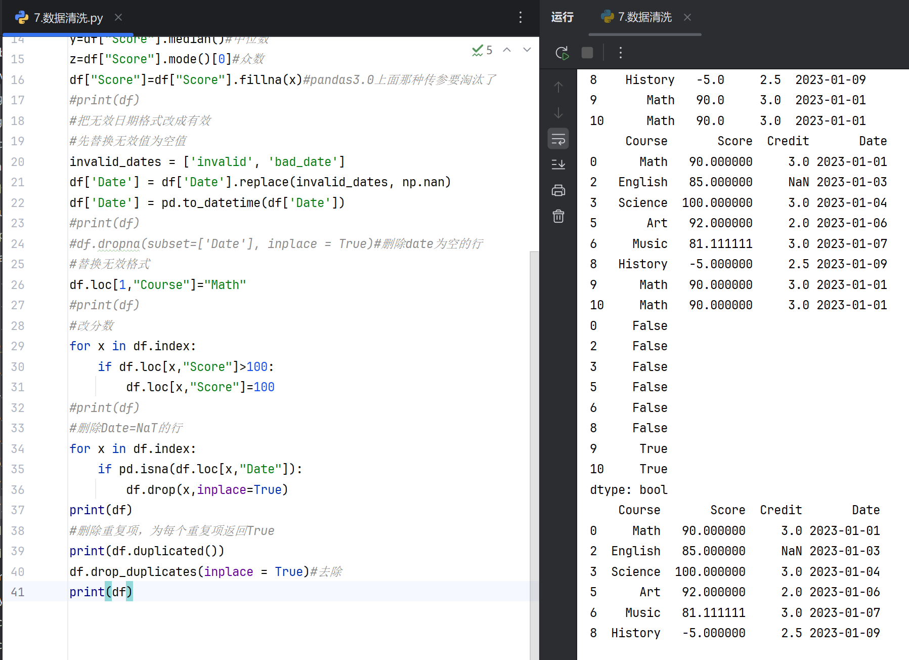 drop_duplicates()删除重复行。 - 数据类型转换: