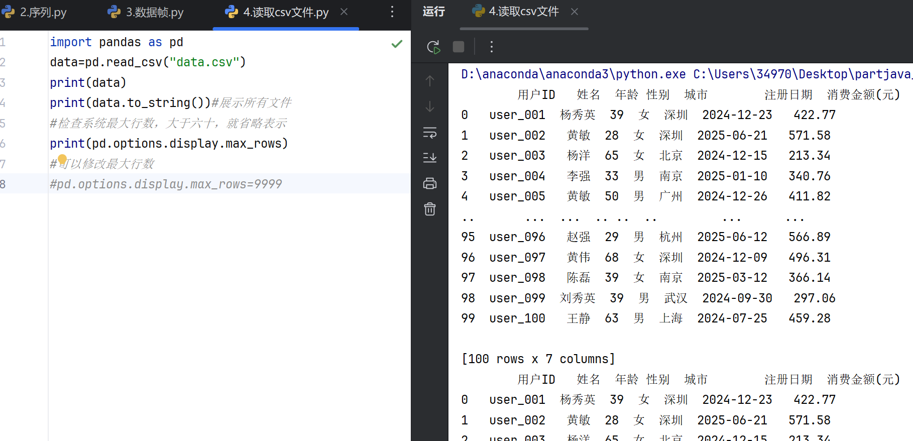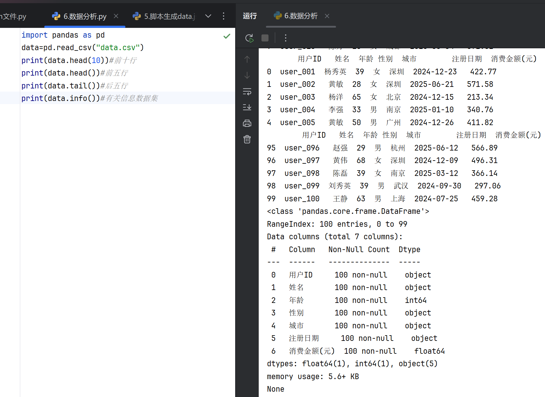 读取数据:支持从 CSV、Excel、SQL、JSON 等格式加载数据,常用函数如 read_csv()、read_excel()。 查看数据:head() 显示前几行数据,tail() 显示后几行数据,info() 提供数据概览(如列名、数据类型、非空值数量)。