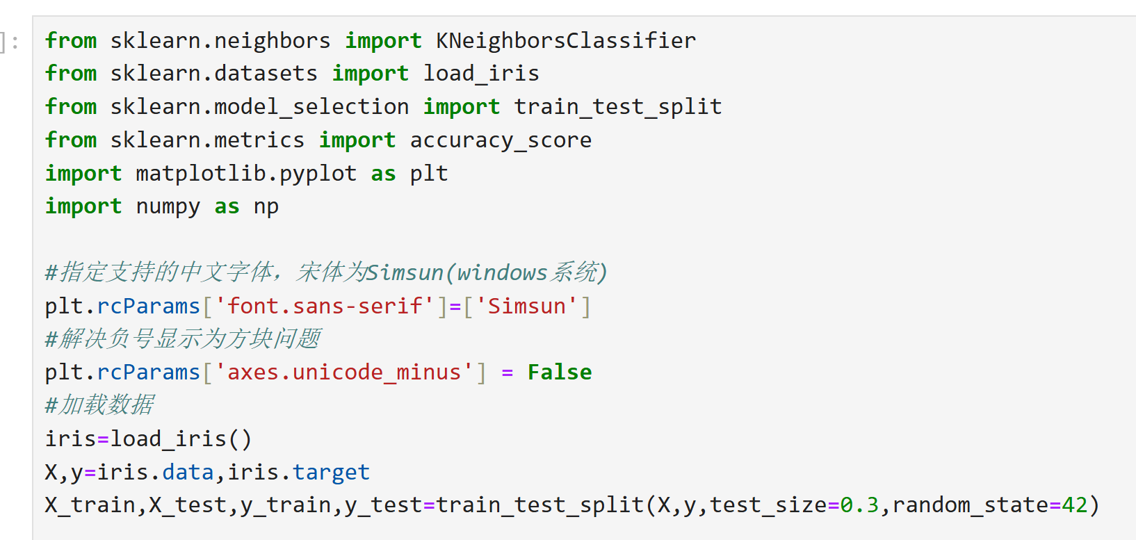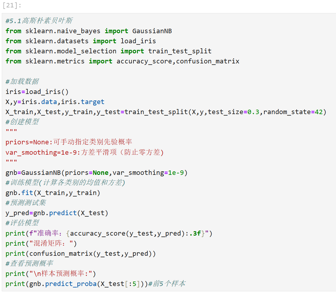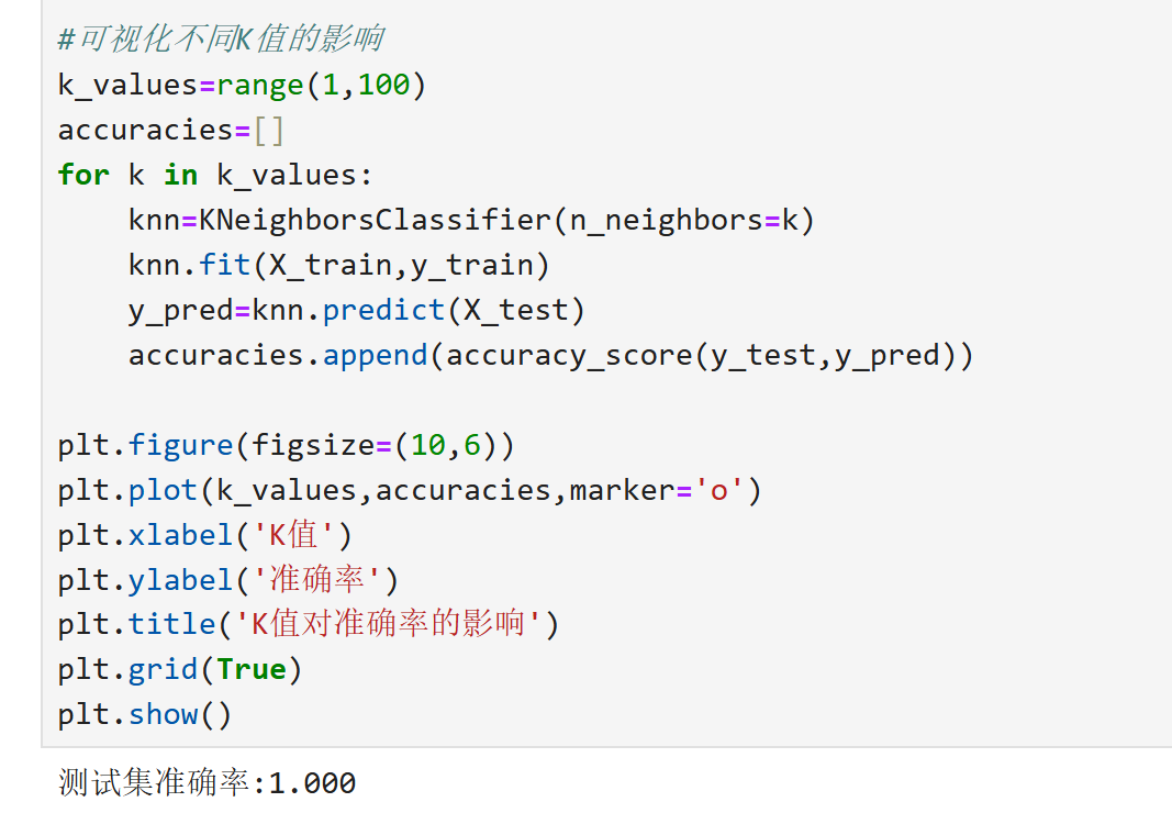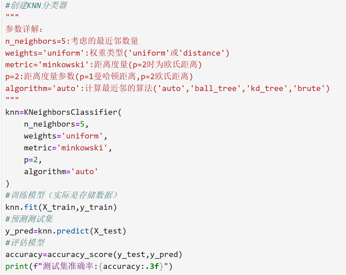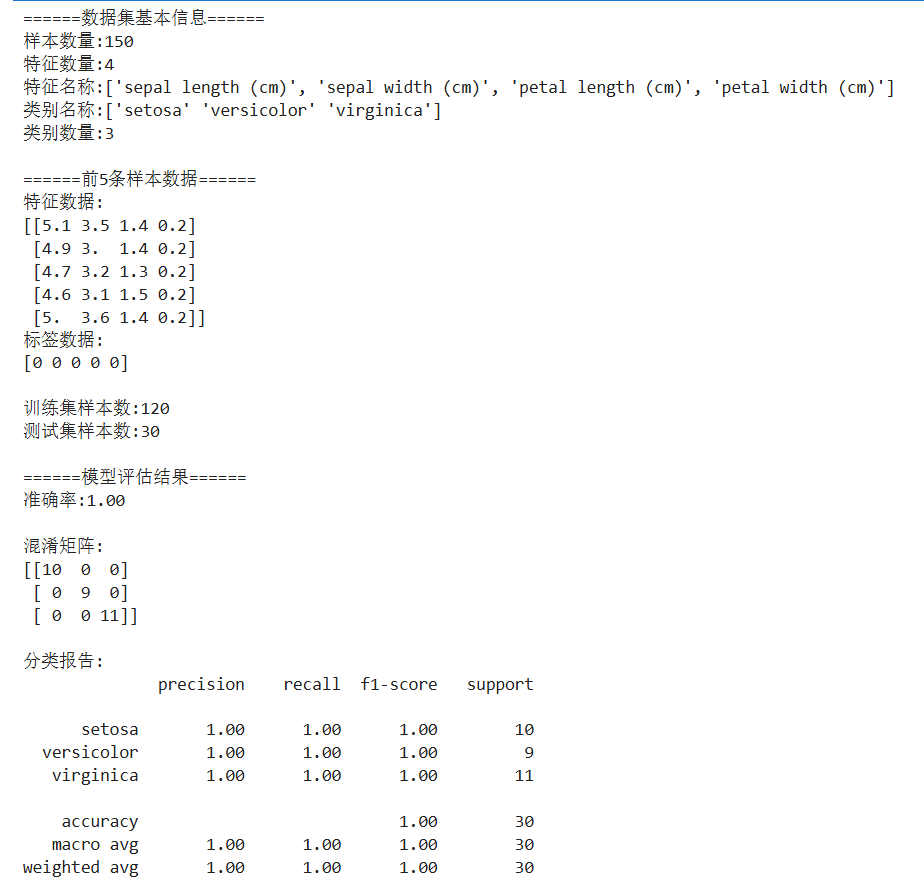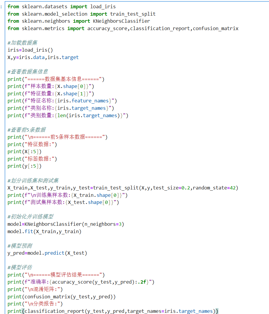 load_iris()返回包含特征(data)和标签(target)的数据集。train_test_split默认划分 75% 训练集和 25% 测试集(此处调整为 80/20)。- KNN 分类器通过
