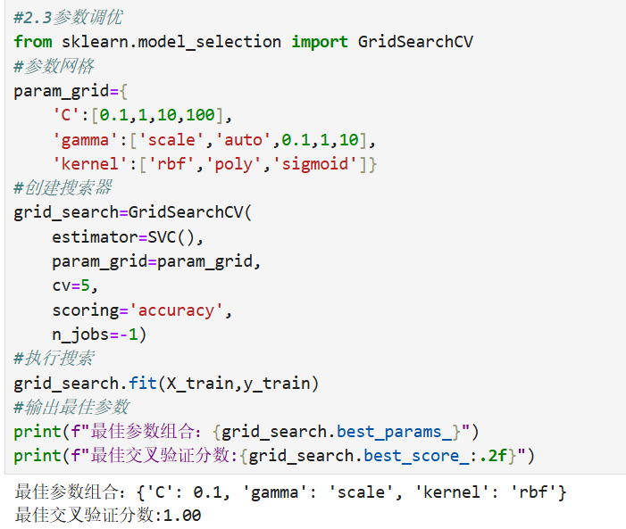 - 随机搜索:参数空间大时高效,$n_iter$ 控制计算量